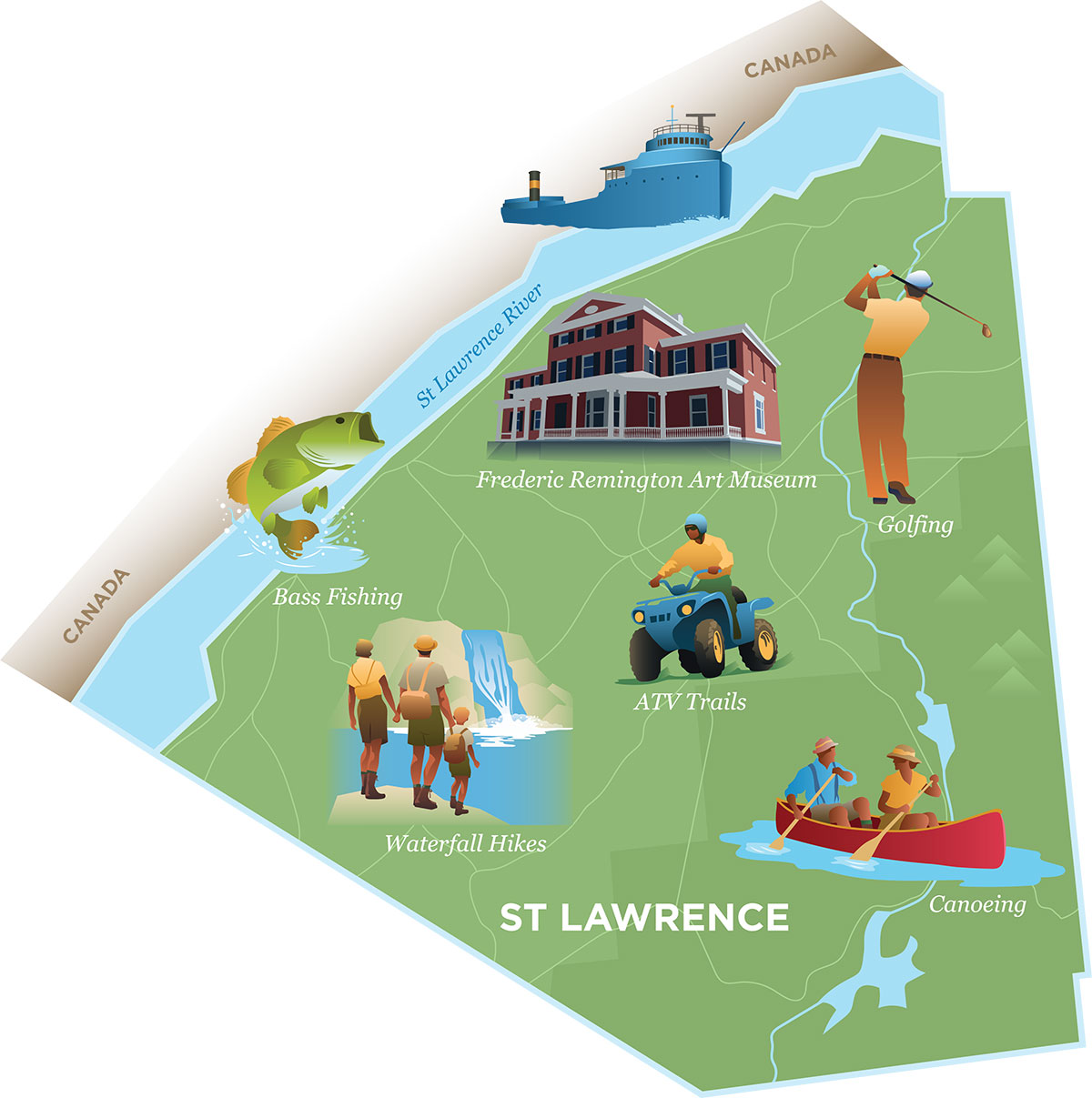 St. Lawrence County is a vast and undiscovered area of New York’s Northern Border reaching from the St. Lawrence River to the foothills of the Adirondack mountains. Rural farms, including a large Amish community, meet small town charm with colleges, industry and history. The county’s diverse natural and cultural resources make St. Lawrence a perfect destination for those who love paddling, waterfalls, hiking, folk music & local art, wine tasting and farm to table cuisine. St. Lawrence County also provides a perfect place for fisherman who love fishing bass, muskie and carp.